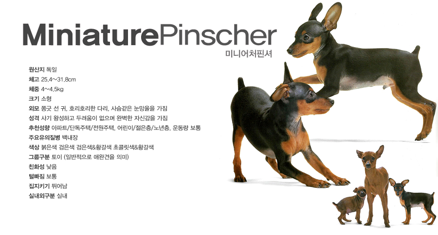 미니핀 Miniature Pinscher 동종견 보기 해당 정보는 펫갤러리아에서 제공하는 반려견 정보로 무단 도용시 저작권법 등에 따라 법적 책임을 질 수 있습니다.